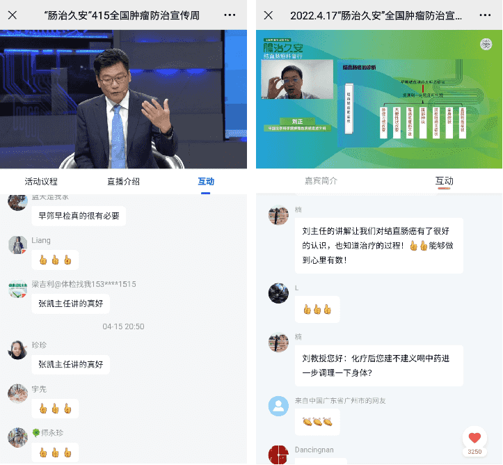 本次全國(guó)腫瘤防治宣傳周吸引了結(jié)直腸領(lǐng)域超38名各級(jí)專家大咖積極參與。其中,由中國(guó)醫(yī)師協(xié)會(huì)主辦,康立明生物協(xié)辦的“腸治久安”415全國(guó)腫瘤防治宣傳周活動(dòng)共舉辦線上直播7場(chǎng),邀請(qǐng)中國(guó)醫(yī)學(xué)科學(xué)院腫瘤醫(yī)院王錫山教授、張凱教授,首都醫(yī)科大學(xué)附屬北京友誼醫(yī)院冀明教授等共9位專家大咖參與現(xiàn)場(chǎng)訪談與科普;聯(lián)合5位結(jié)直腸領(lǐng)域?qū)<覅⑴c“腸治久安”宣傳周專家視頻錄制?!耙癖pB(yǎng)愛(ài)車(chē)一樣愛(ài)惜自己的身體”、“發(fā)現(xiàn)癌癥不光榮,發(fā)現(xiàn)早期癌癥才光榮”等金句也隨著科普直播的擴(kuò)散為大眾所熟知。