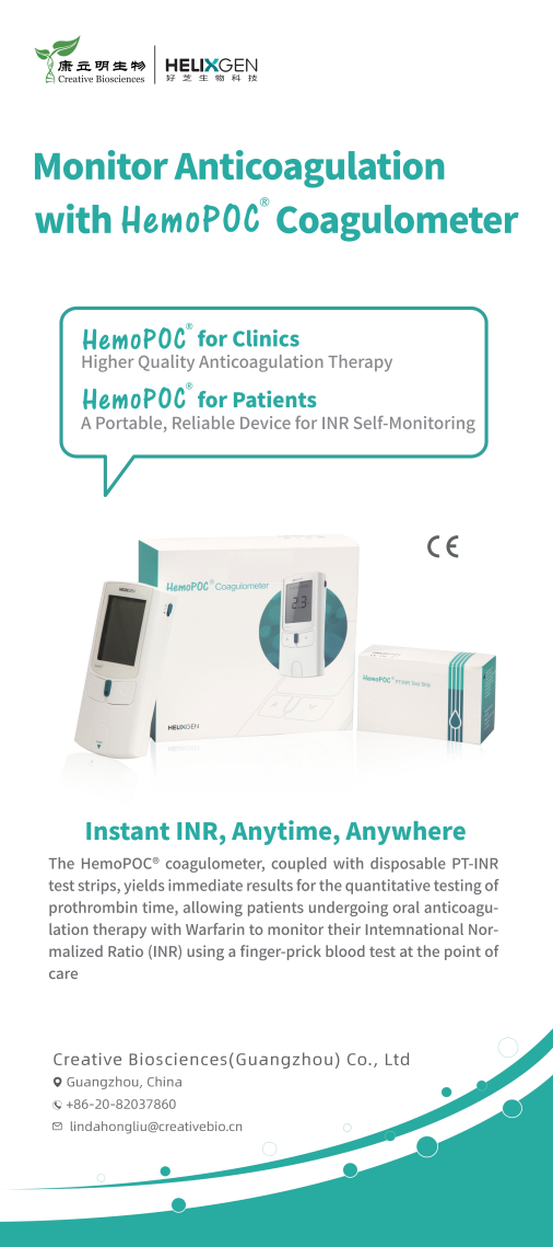 此外,康立明全資子公司好芝生物產(chǎn)品HemoPOC®凝血檢測系統(tǒng)也將亮相此次檢驗盛會。HemoPOC®凝血檢測儀是一款便攜式凝血檢測設(shè)備,與配套的檢測卡組成。HemoPOC®凝血檢測系統(tǒng),用于定量測定新鮮指尖毛細(xì)血管血的凝血酶原時間。該系統(tǒng)操作簡單(凝血檢測操作視頻),滿足即時檢測及床旁檢測的應(yīng)用需求,增強(qiáng)抗凝管理和慢病管理的有效性。