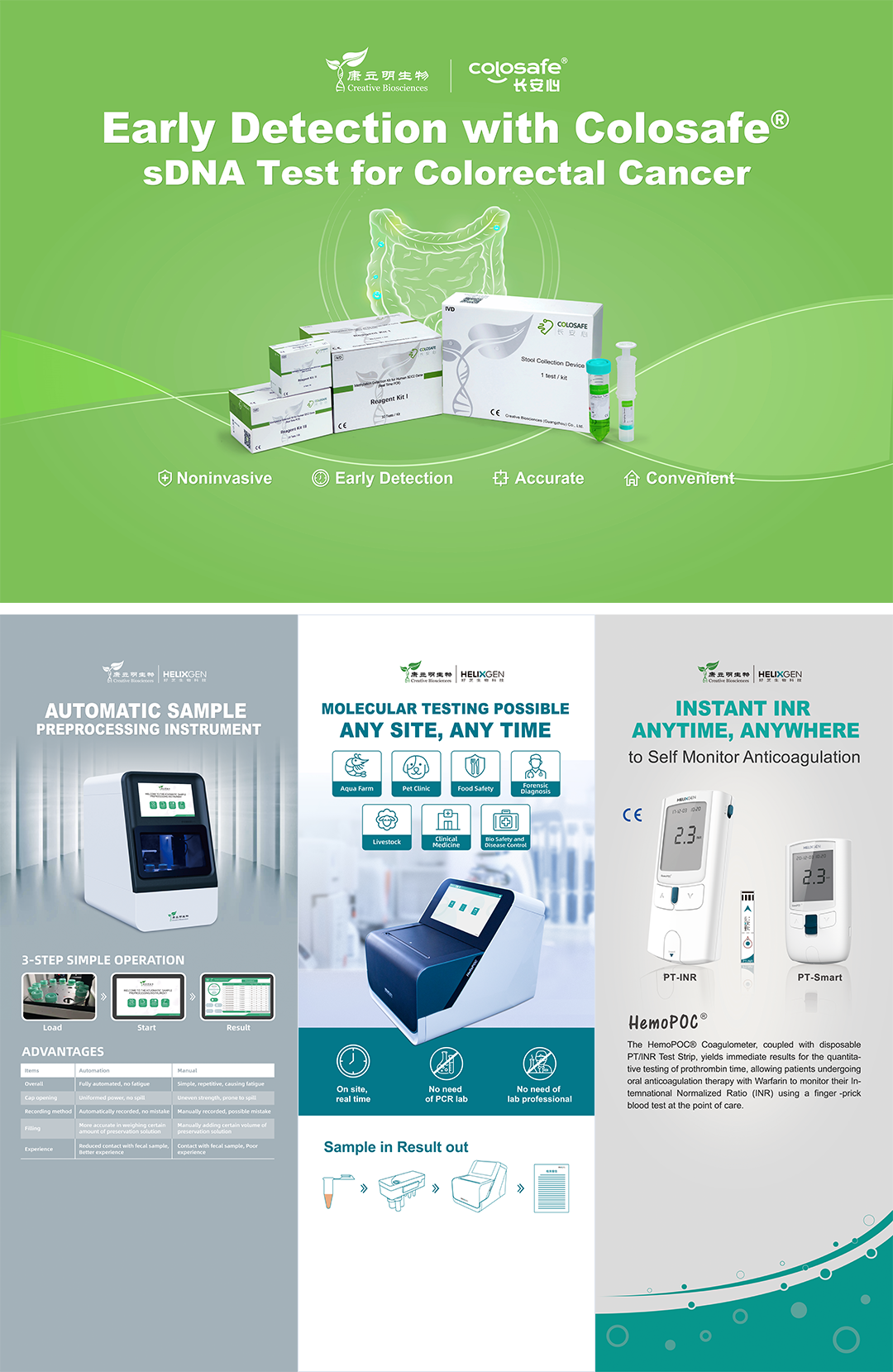 本次盛會,康立明生物攜長安心®糞便DNA腸癌檢測、久安心®膀胱癌基因檢測、會安心®肺癌基因檢測、全自動樣本預(yù)處理儀以及康立明全資子公司好芝生物產(chǎn)品HelixPOC®全自動微流控?zé)晒?/span>PCR一體機(jī)、HemoPOC®凝血檢測系統(tǒng)赴展。
